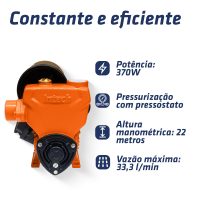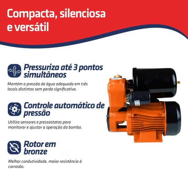 Ela dispõe de um dispositivo pressostato que mantém a leitura constante da tubulação d’água. Desta forma, sempre que houver alguma alteração no fluxo d’água, o sistema é acionado para equalizar a pressão ideal, gerando uma ação automática do sistema. A BFP370 é compacta e silenciosa.