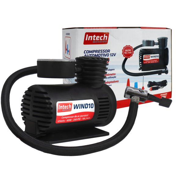 O Compressor de Ar Automotivo WIND10 da Intech Machine é leve, compacto e portátil, ideal para você transportar em suas viagens. Ele permite que você encha pneus de carros, motos, bicicletas, bolas, balões de aniversário e colchões infláveis, entre outros. Sua pressão máxima é de 250psi e possui uma excelente potência de 60w. Ele vem equipado com manômetro em 2 escalas, que proporciona uma calibragem muito mais precisa e de fácil entendimento. O WIND10 é muito simples de usar, basta ligar seu plug ao conector 12v (acendedor de cigarros) do seu veículo. Seu cabo elétrico de 2,8 metros e sua mangueira de 40cm facilitam o alcance em vários locais. Além disso, acompanham o WIND10 três bicos adaptadores: bico agulha para bolas, bico soprador para limpar superfícies e equipamentos e bico para infláveis em geral, que tornam sua utilização ainda mais prática. Todas essas vantagens fazem do WIND10 o compressor automotivo ideal para você. Adquira já o seu!