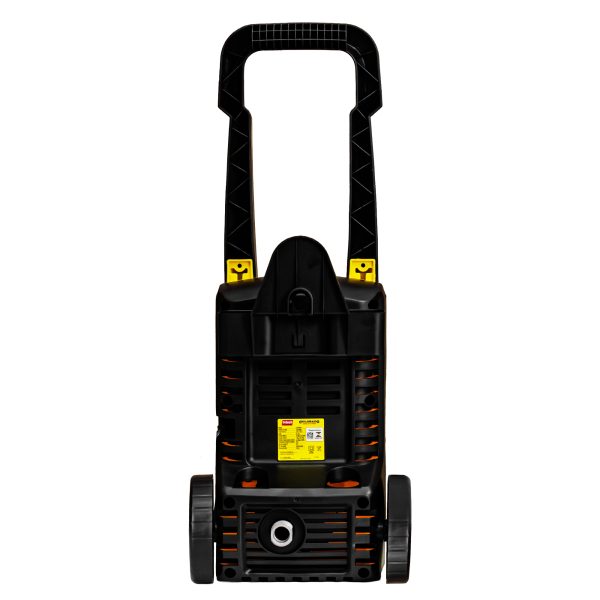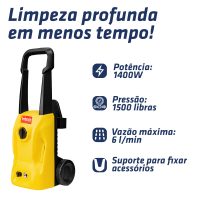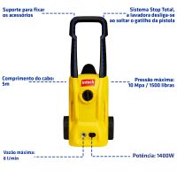 Repleta de acessórios: bico jato regulável, shampoozeira, pistola, mangueira de alta pressão e engate rápido