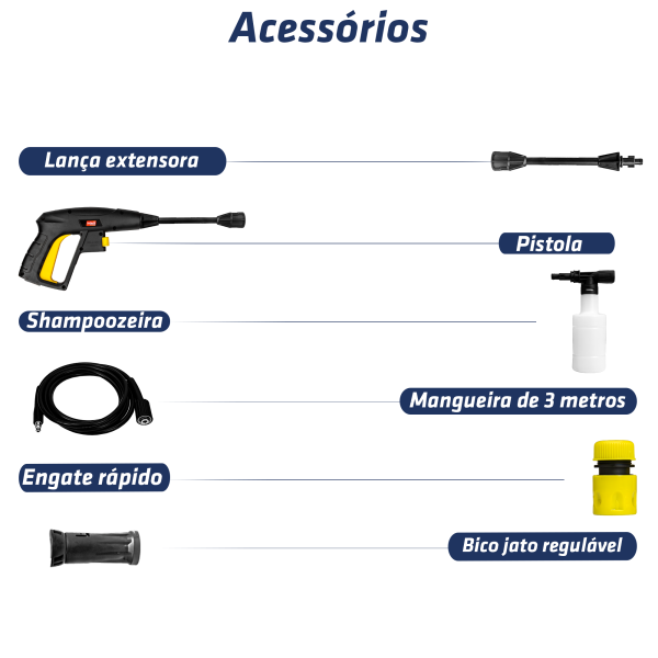 Acessórios: bico jato regulável, shampoozeira, pistola, mangueira de alta pressão e engate rápido