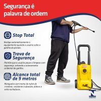A lavadora conta com o sistema Stop Total, que desliga automaticamente o equipamento ao soltar a pistola, evitando desperdício de água e aumentando a vida útil do motor.
