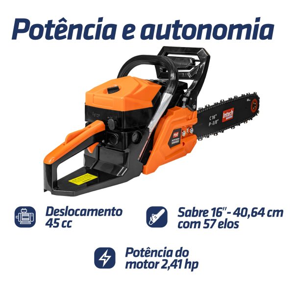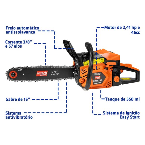 Potência, tecnologia, conforto e segurança! São muitas as razões para você não querer ficar sem esta fantástica motosserra da Intech Machine. Adquira já a sua!
