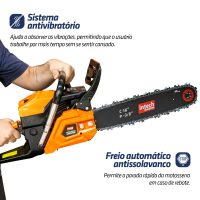 Segurança é palavra de ordem no projeto da SAW4500. Por isso, ela possui um freio automático antissolavanco, que permite a parada rápida da motosserra em caso de rebote.